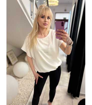 Elegancka bluzka wykonana z wiskozy, z krótkimi rękawkami, z dekoltem w łódkę , dół wykończony gumką , wkładana przez głowę.