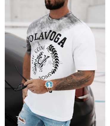 Oversizowy t-shirt z krótkim rękawkiem, wykonany z wysokiej jakości, elastycznej bawełny. Na przodzie znajduje się duże logo marki O La Voga a także farbowane zdobienia w kolorze szarym.