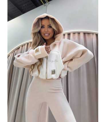 Przepiękny komplet dresowy. Bluza z kapturem, rozpinana, zapinana na złoty zamek, zdobiona złotymi naszywkami z logo firmy, z kieszeniami z przodu. Posiada rękawy z otworem na kciuk.
