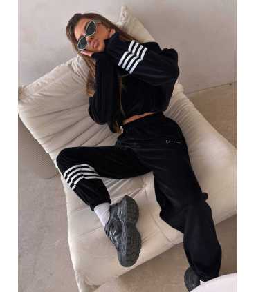 Spodnie z wysokim stanem, w pasie z gumką , posiadają kieszenie po bokach. Idealny zestaw na każdą porę roku, materiał i wykonanie dla najbardziej wymagających klientek. Bluza z haftowanym Logo marki , całość z białymi paskami w postaci lampasów , nadają mu nowoczesny, designerski charakter.