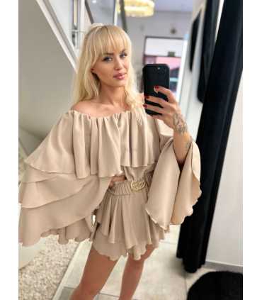 - 👗 Efektowna forma z podwójną falbaną i odkrytymi ramionami (hiszpanka)