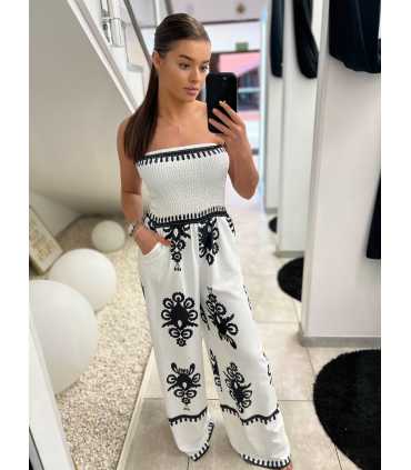 Przepiękny, zwiewny kombinezon z najmodniejszą w tym sezonie szeroką nogawką. Kombinezon tuba , z elastyczną gumą na biuście, bez ramiączek. Wykonany ze zwiewnego, materiału. Posiada gumkę w pasie, idealnie dopasowuje się do kobiecej sylwetki, z kieszeniami po bokach.