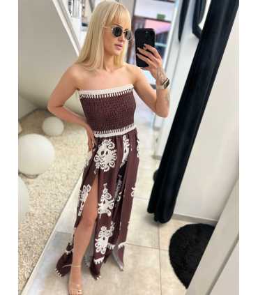 Przepiękny, zwiewny kombinezon z najmodniejszą w tym sezonie szeroką nogawką, i fantazyjnym wycięciem na nogawkach. Kombinezon tuba , z elastyczną gumą na biuście, bez ramiączek. Wykonany ze zwiewnego, materiału. Posiada gumkę w pasie, idealnie dopasowuje się do kobiecej sylwetki, z kieszeniami po bokach.