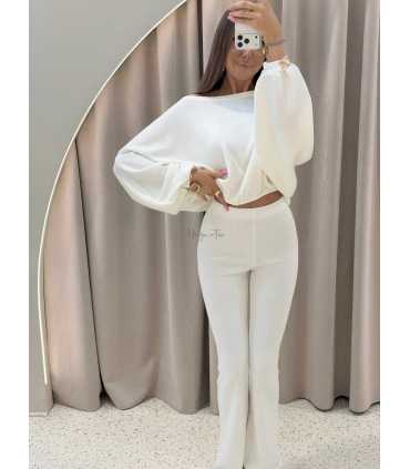 Zjawiskowy komplet Taboo składający się z oversizowej bluzy, a także dopasowanych spodni z rozszerzaną na dole nogawką. Komplet wykonany jest z elastycznej, cienkiej sweterkowej dzianiny.
