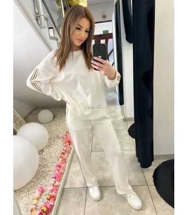 NB202 Komplet Dresowy Damski Masełkowy Szeroka Nogawka Lampasy Biały