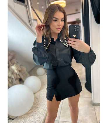 Elegancka, stylowa koszula z kołnierzykiem i z długim rękawem. Koszula zapinana z przodu na guziczki, z dużym kołnierzykiem przepięknie zdobionym srebrnymi kamieniami.