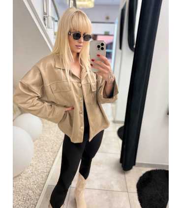 Katana, cienka kurtka wykonana z wysokogatunkowej ekologicznej ekoskóry zamszowej. Fason oversize, z kołnierzykiem , zapinana na złote guziki.