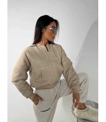 Kurteczka model bomberka, wykonana z mięciutkiej ekoskóry , model ocieplany, stójka, pas i rękawy wykończone ściągaczem. Kurtka na podszewce, na stójce, zapinana z przodu na zamek, posiada kieszenie po bokach. Zdobiona haftowanym logo firmy.