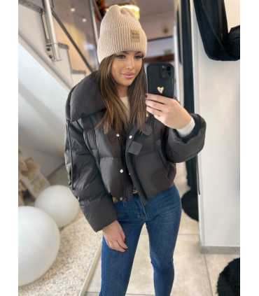 Kurtka puchowa z kapturem wypełniona naturalnym puchem z wysokim kołnierzem – elegancja i ciepło w jednym. Zapinana z przodu na zamek, z kieszeniami po bokach. Dół regulowany troczkami i elastycznymi ściągaczami, dzięki czemu idealnie dopasowuje się do sylwetki.
