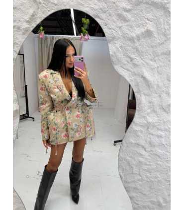Model Rozalia Dłuższa wykonany jest z luksusowej tkaniny żakardowej z bogatym, kwiatowym wzorem tkanym / haftowanym. To nie nadruk, lecz strukturalny print, który nadaje marynarce głębi, elegancji i ekskluzywnego charakteru. Każda sztuka prezentuje się niezwykle szlachetnie i jest jedyna w swoim rodzaju.