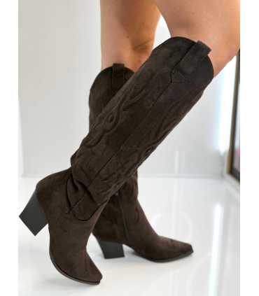 Stylowe kozaki w modnym fasonie kowbojek, wykonane z miękkiej ekoskóry zamszowej w odcieniu czekolady. Smukła, dopasowana cholewka sięgająca pod kolano pięknie podkreśla nogę, a delikatny haft w tym samym kolorze dodaje subtelnego, westernowego charakteru.