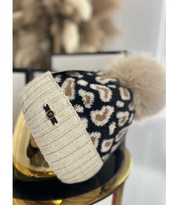 C017 Czapka Z Pomponem Panterka Beżowa