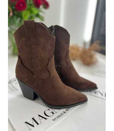 Stylowe botki w modnym fasonie kowbojek, wykonane z miękkiej ekoskóry zamszowej w odcieniu czekolady. Smukła, dopasowana cholewka sięgająca pod kolano pięknie podkreśla nogę, a delikatny haft w tym samym kolorze dodaje subtelnego, westernowego charakteru.