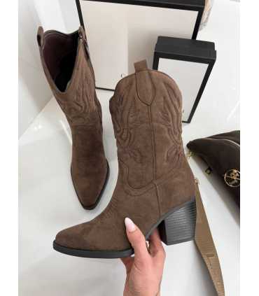 Stylowe botki w modnym fasonie kowbojek, wykonane z miękkiej ekoskóry zamszowej w odcieniu czekolady. Smukła, dopasowana cholewka pięknie podkreśla nogę, a delikatny haft w tym samym kolorze dodaje subtelnego, westernowego charakteru.