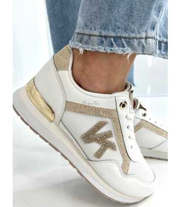 Styl, który przyciąga spojrzenia! 🤍 Te wyjątkowe sneakersy to połączenie klasycznej bieli z eleganckimi, złotymi akcentami. Ozdobne logo z kryształkami nadaje im biżuteryjnego charakteru, a subtelne wstawki w odcieniu złota pięknie podkreślają całość.