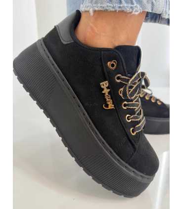 B204 Sneakersy Damskie Na Platformie – Modne Buty Sportowe z Cyrkoniami i Złotymi Dodatkami Ekoskóra Zamszowa Czarne