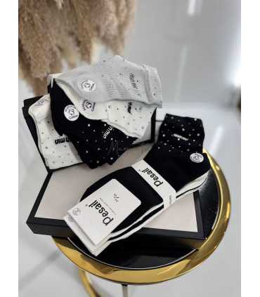 Wygodne skarpetki damskie wykonane z miękkiej, naturalnej bawełny. Przyjemne w dotyku, elastyczne i komfortowe w codziennym noszeniu. Delikatne zdobienie w postaci drobnych kryształków dodaje im stylowego wyglądu.