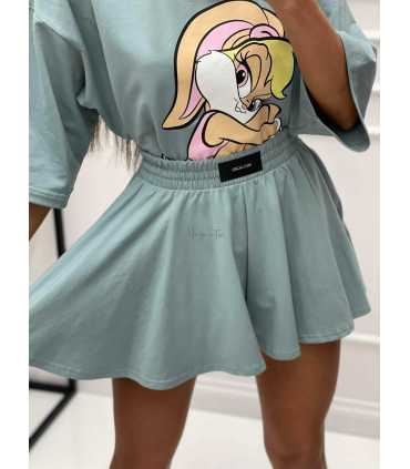 Krótkie szorty z wyższym stanem i gumką w pasie, model rozkloszowany. Posiadają gumkę w pasie, dzięki czemu dopasowują się do sylwetki.