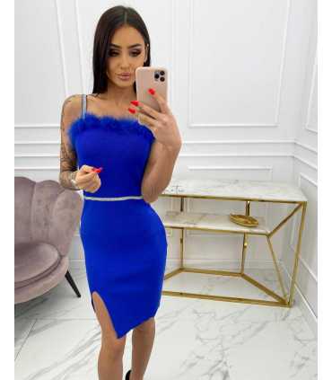Elegancka sukienka na cienkich, regulowanych ramiączkach, z seksownym rozcięciem na nodze. Przepięknie zdobiona na dekolcie piórkami. Wykonana z dzianiny sweterkowej, elastyczna idealnie podkreśla i modeluje sylwetkę..