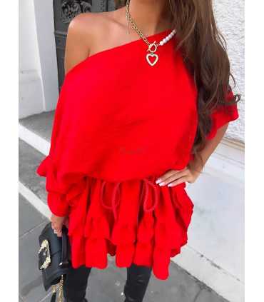 Elegancka sukienka z rozszerzanym rękawem. Opuszczana na ramiona, fason hiszpanka. Rękawy i dół wykończone falbankami. Przewiązywana w pasie sznurkiem. Wykonana z eleganckiego, zwiewnego materiału.
