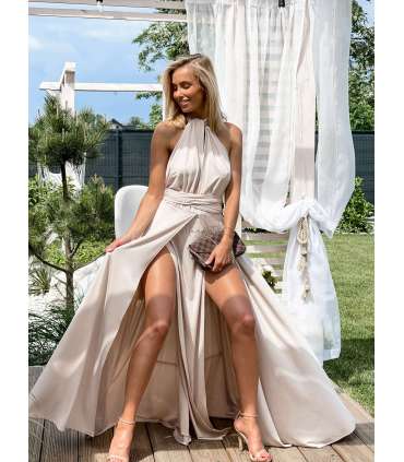 Przepiękna sukienka wykonana z lejącego się materiału, idealna na letnie upały. Posiada w pasie wszytą gumkę, dzięki czemu idealnie dopasowuje się do kobiecej sylwetki. Sukienka w wersji w maxi, z rozcięciami na całości spódnicy, i jej największą zaletą jest możliwości wiązania na wiele różnych sposobów.