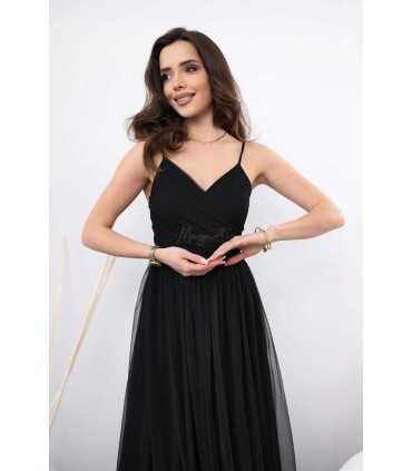 M513 Sukienka Tiulowa Z Rozcięciem Na Cienkich Ramiączkach Czarna