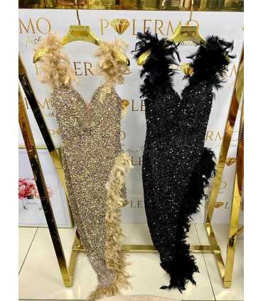 Sukienka pięknie eksponuje plecy, z przodu posiada wszyte miseczki, dzięki czemu nie trzeba zakładać biustonosza. Całość wyszywana czarnymi, błyszczącymi cekinami. Przepięknie zdobiona czarnymi piurami z marabuta.