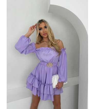 Elegancka sukienka z długim, pękniętym rękawem. Opuszczana  na ramiona, fason hiszpanka. Sukienka posiada gumkę w pasie, na dekolcie i wykończeniach rękawów. Dół, dekolt i rękawy wykończone falbankami. Odcinana w pasie i rozkloszowana. W komplecie w marszczonym paskiem ze złotą klamrą. Wykonana z eleganckiego, zwiewnego, szyfonowego materiału.
